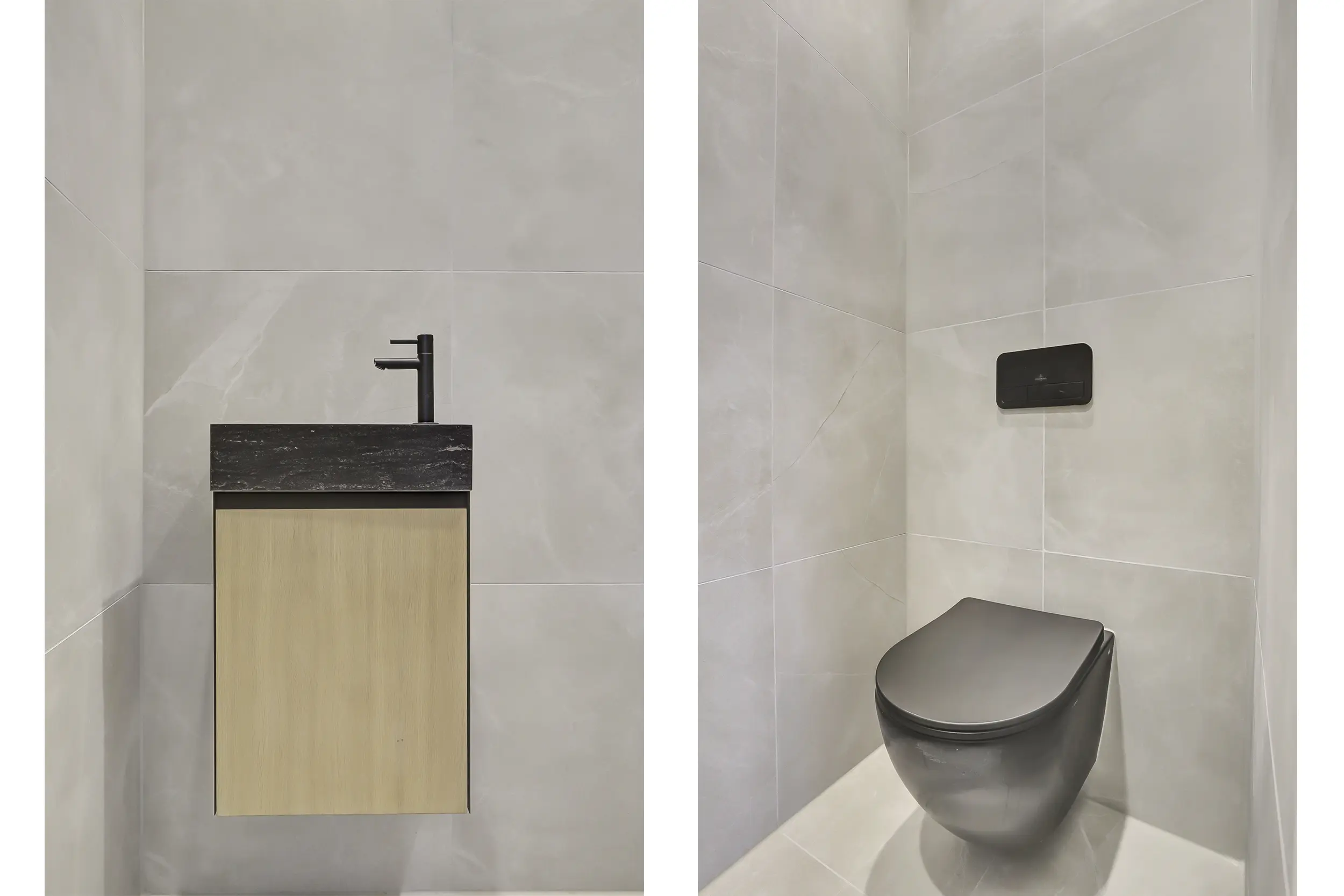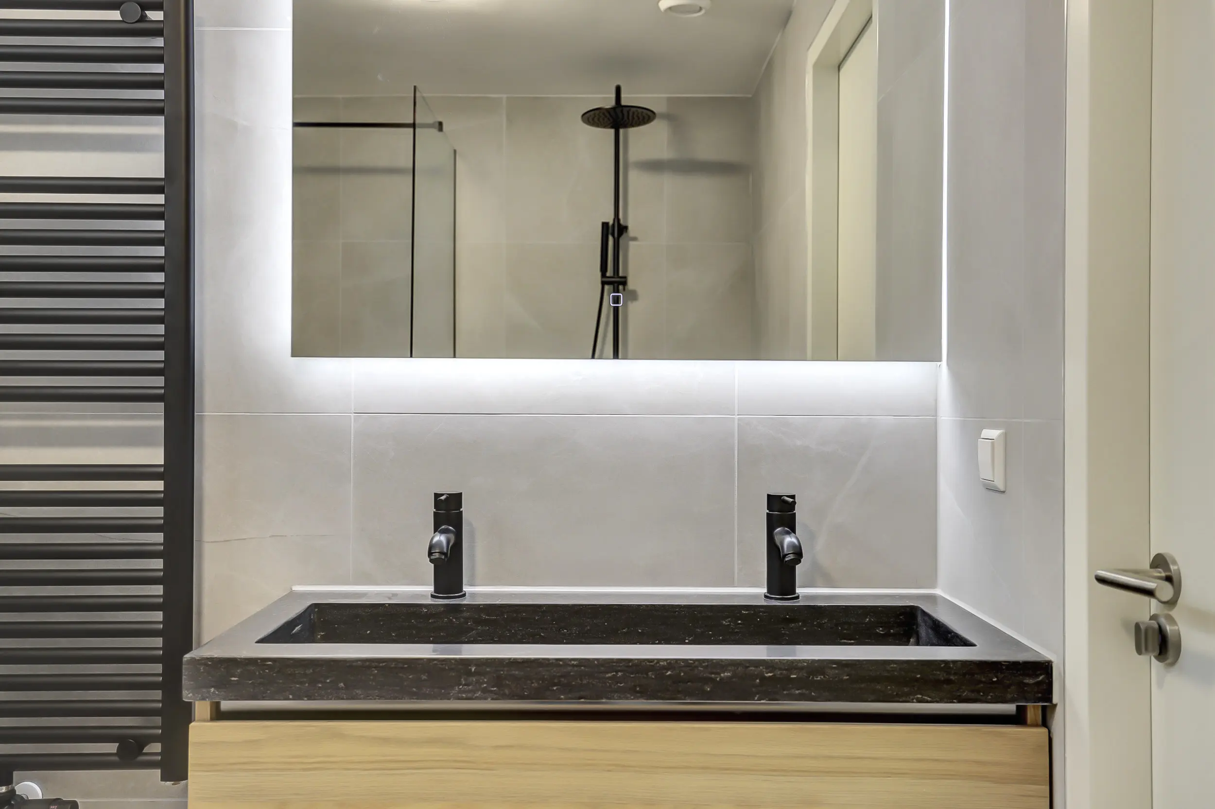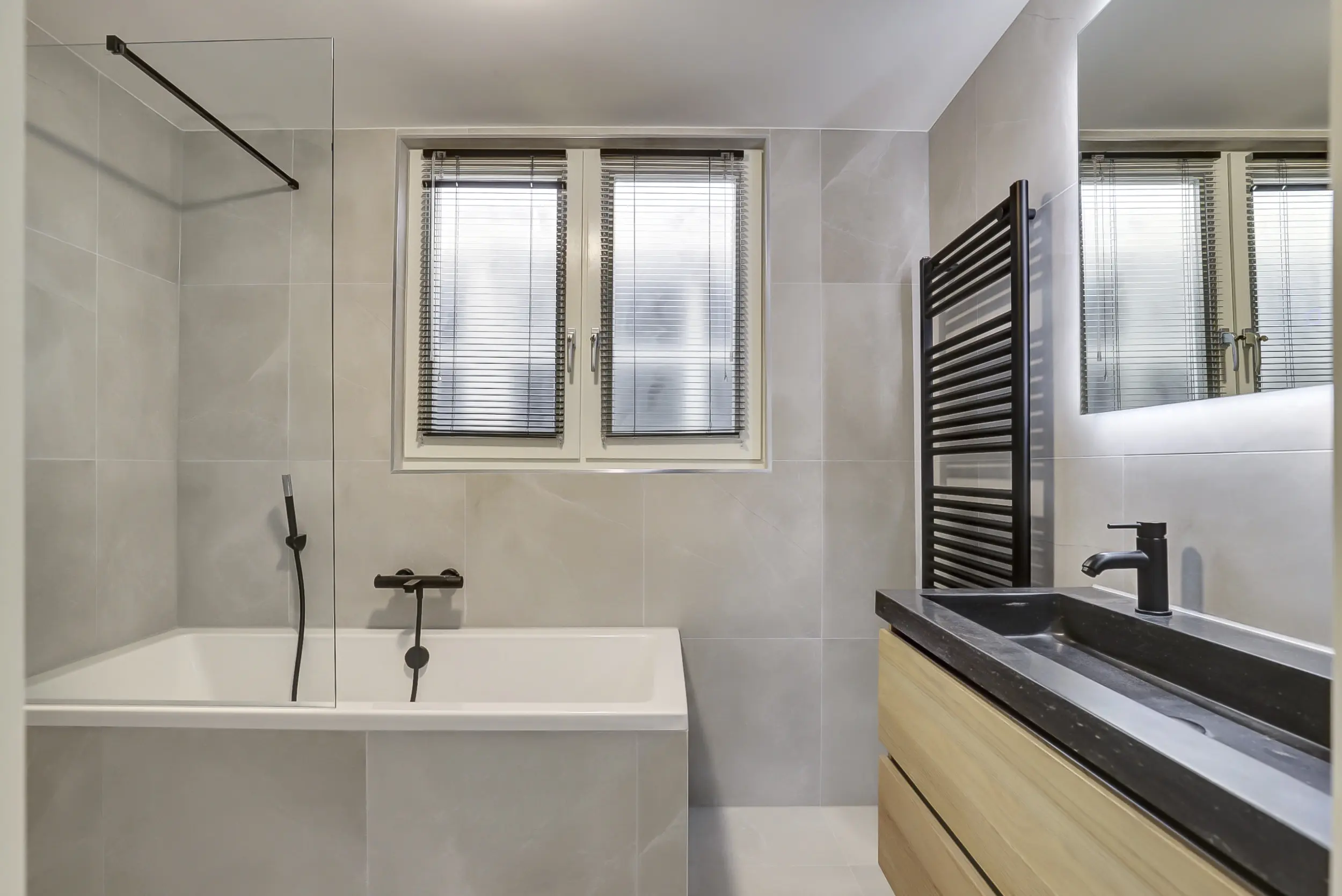 De moderne badkamer is lichtgrijs uitgevoerd en biedt alle comfort, met een ligbad, inloopdouche, dubbel wastafelmeubel en designradiator. Op deze verdieping bevindt zich daarnaast een separaat toilet en de opstelling van de Cv-installatie.