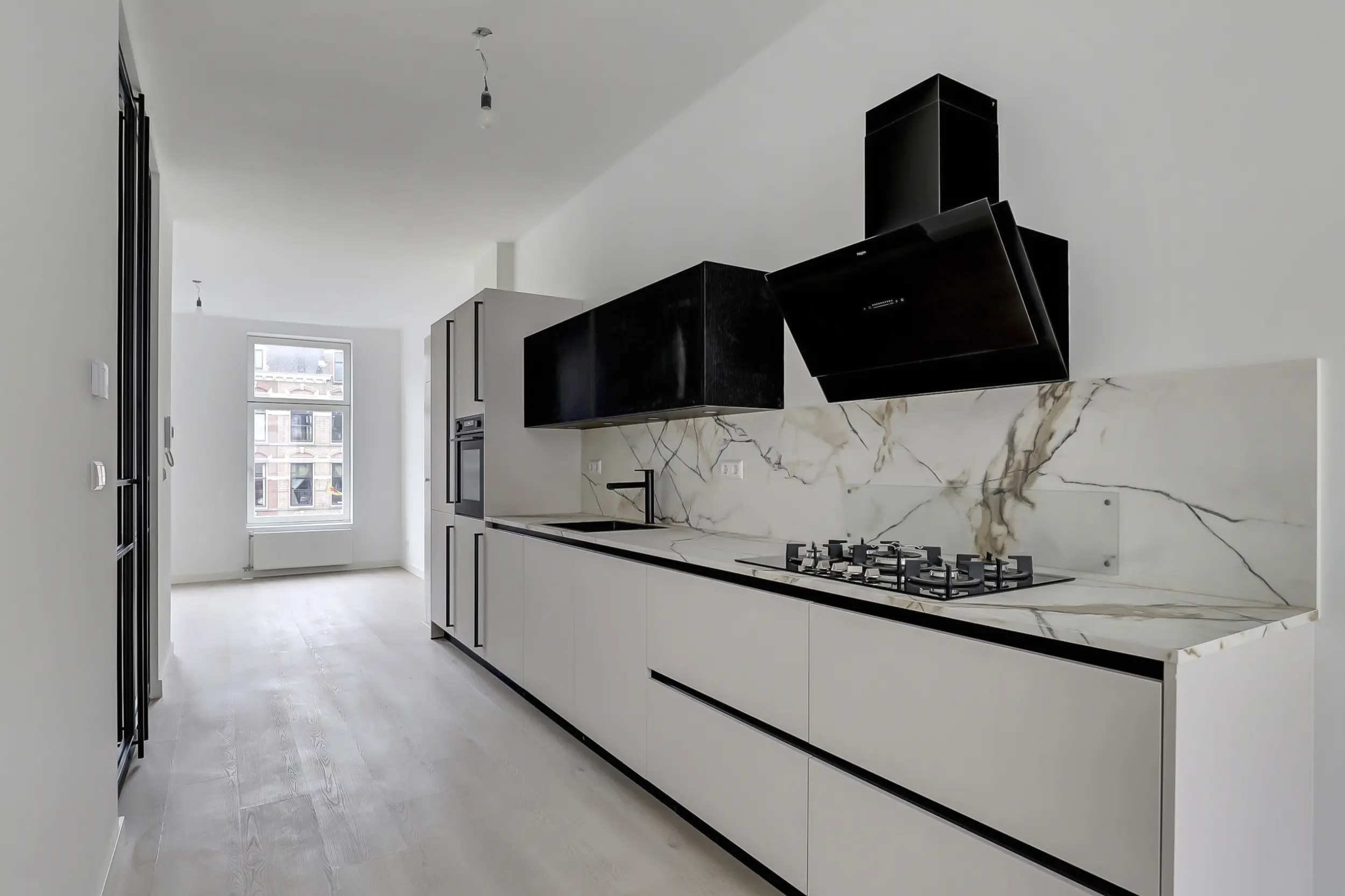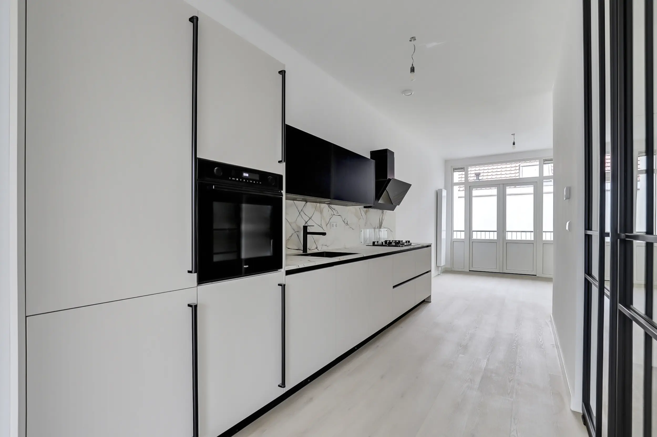 Aan de voorzijde bevindt zich de woonkamer met uitzicht over de Oostzeedijk Beneden, terwijl de achterzijde zich uitstekend leent als eetkamer. Vanuit hier is het eerste balkon bereikbaar, een fijne plek om even buiten te zitten. De hal en woonkamer worden van elkaar gescheiden door stalen designdeuren, waardoor er veel natuurlijk licht in de hal binnenvalt en de woning een open en ruimtelijk gevoel behoudt.