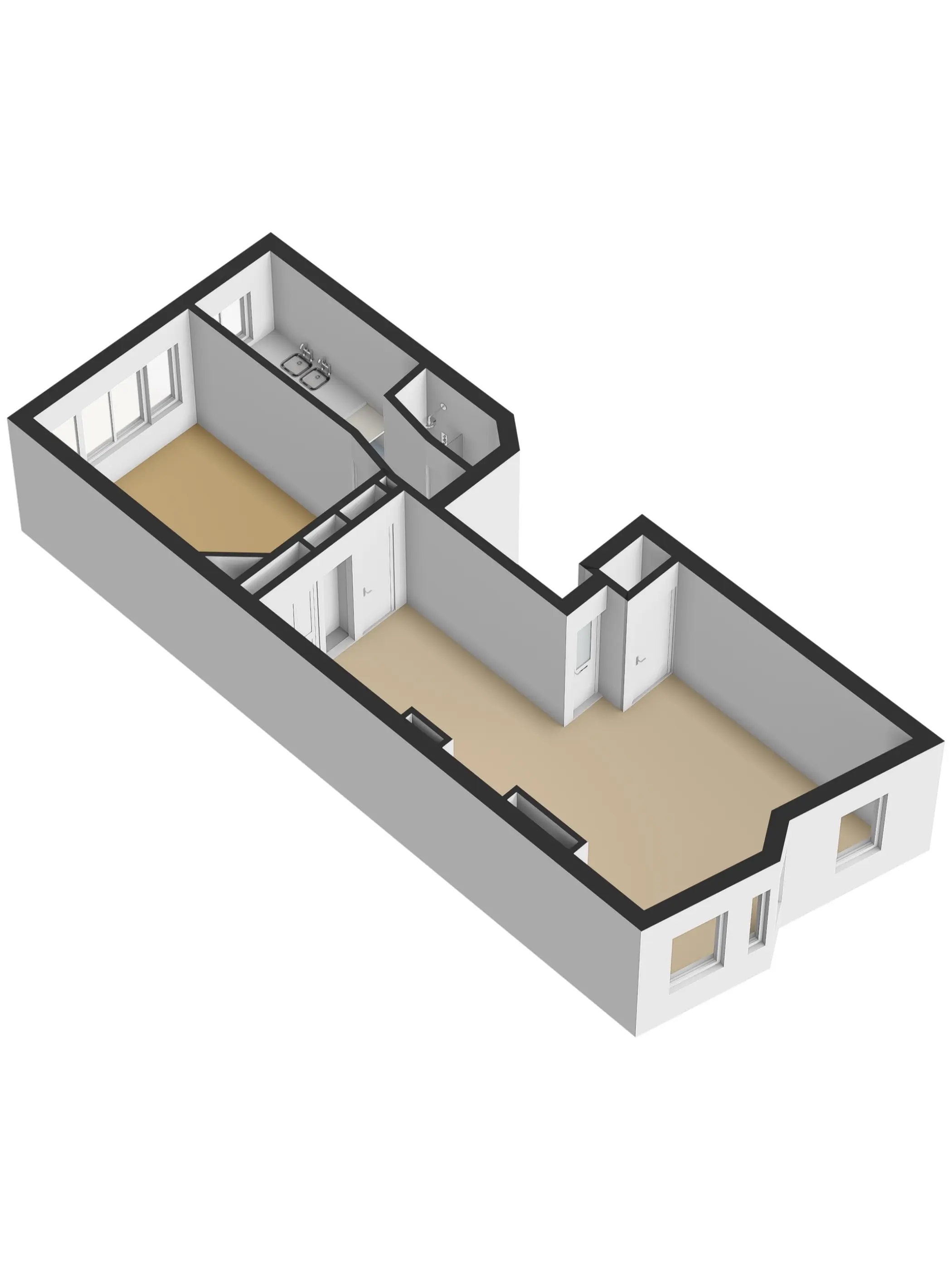 Aan de achterzijde bevindt zich een ruime slaapkamer met eveneens grote ramen, waardoor ook hier het natuurlijke licht naar binnen valt. Vanuit de hal is er toegang tot de eenvoudige keuken met dubbele spoelbak en praktische kastruimte, en de badkamer welke is voorzien van een douche, toilet en wastafel.