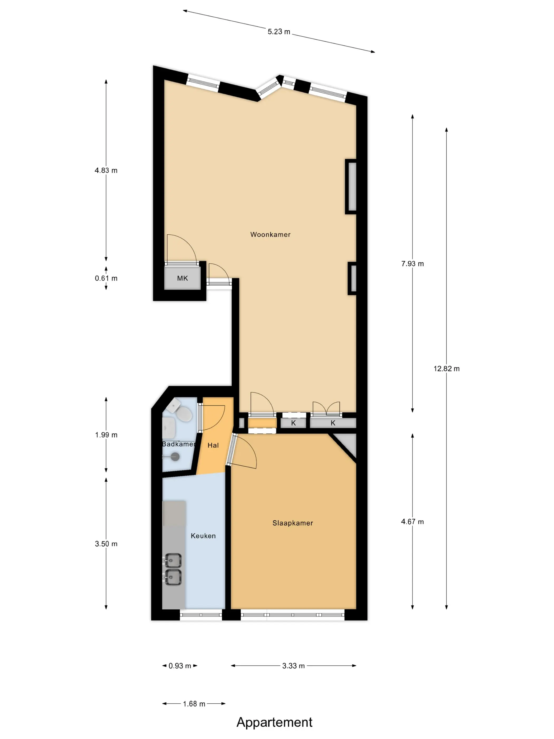 Het appartement is bereikbaar via een gezamenlijke entree met trapopgang naar de derde verdieping. Bij binnenkomst stap je direct de ruime woonkamer, die dankzij de brede raampartijen geniet van veel natuurlijk licht en uitzicht biedt over de levendige Oudedijk.