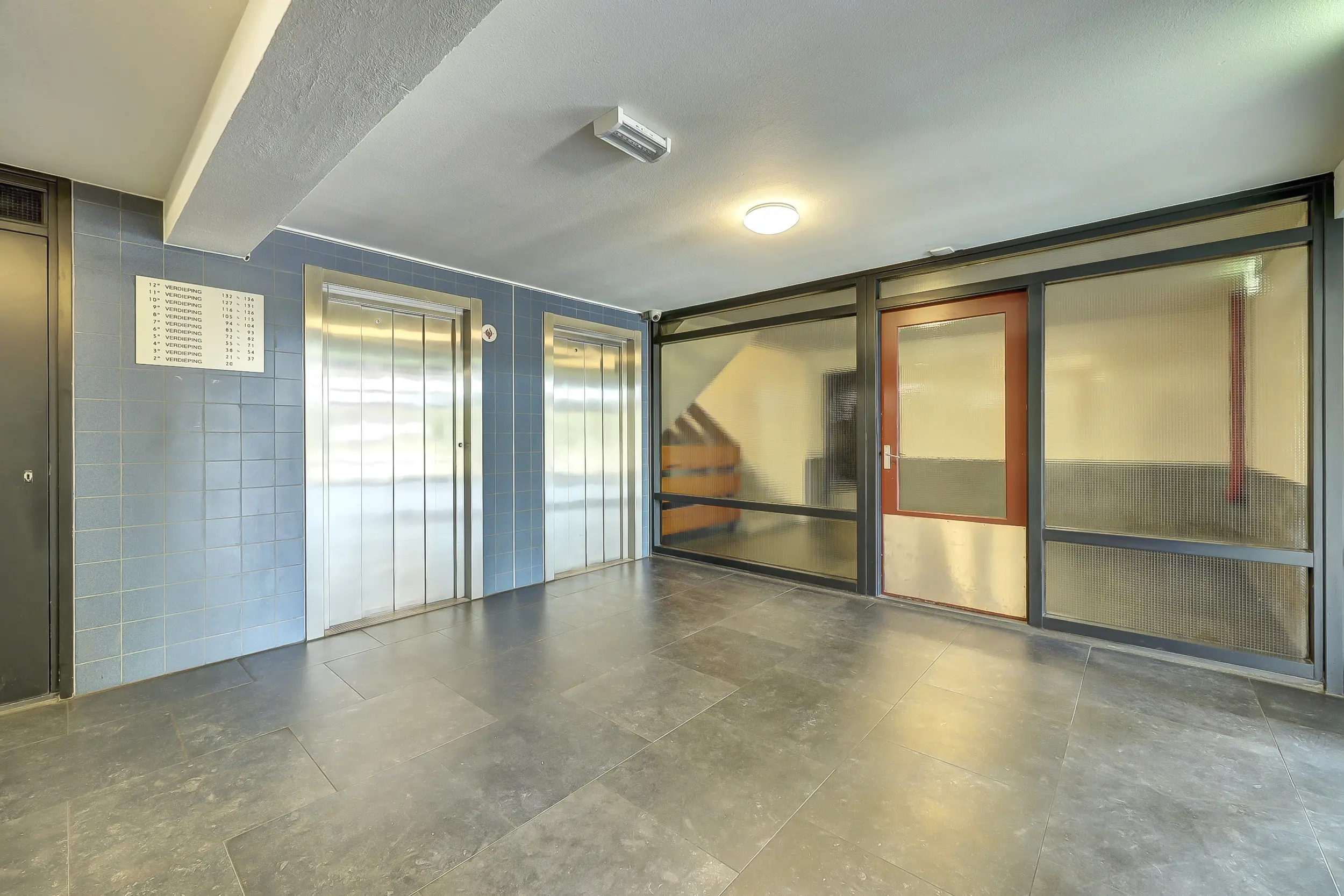 Centrale entree met brievenbussen en bellentableau (videofooninstallatie), afgesloten hal met trappenhuis en twee liften.