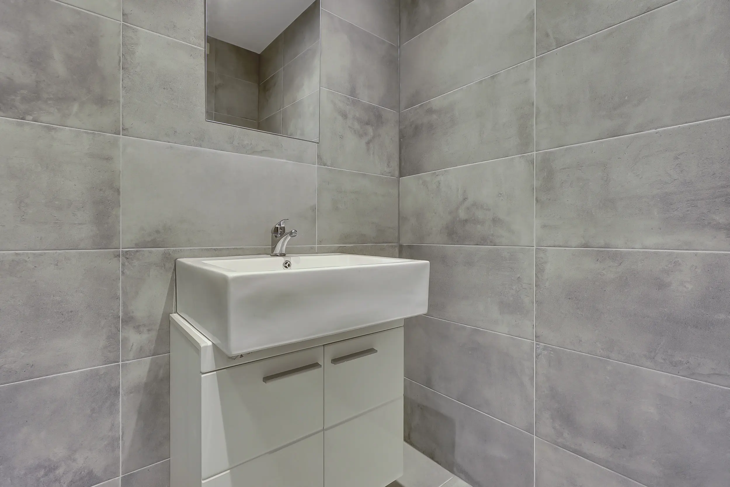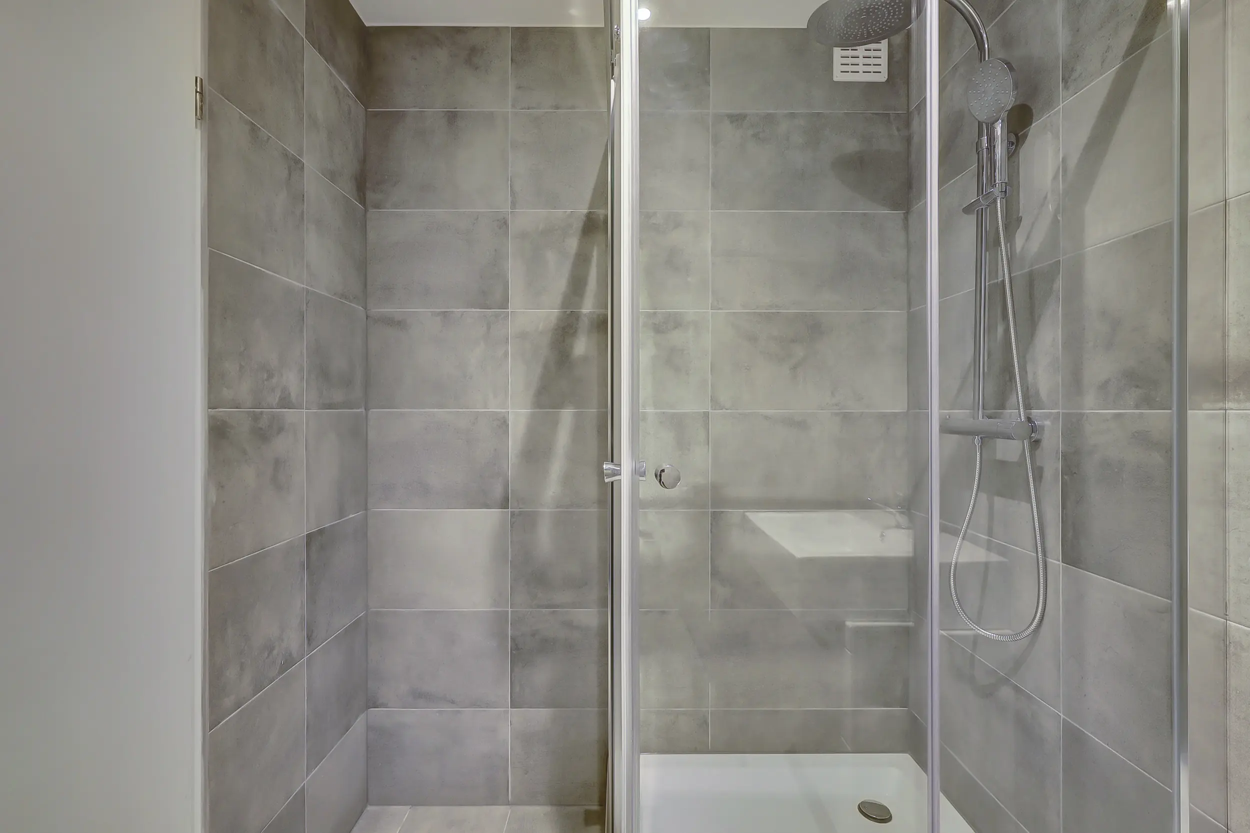 De ruime moderne badkamer (2025) is voorzien van een douche en een stijlvol wastafelmeubel.