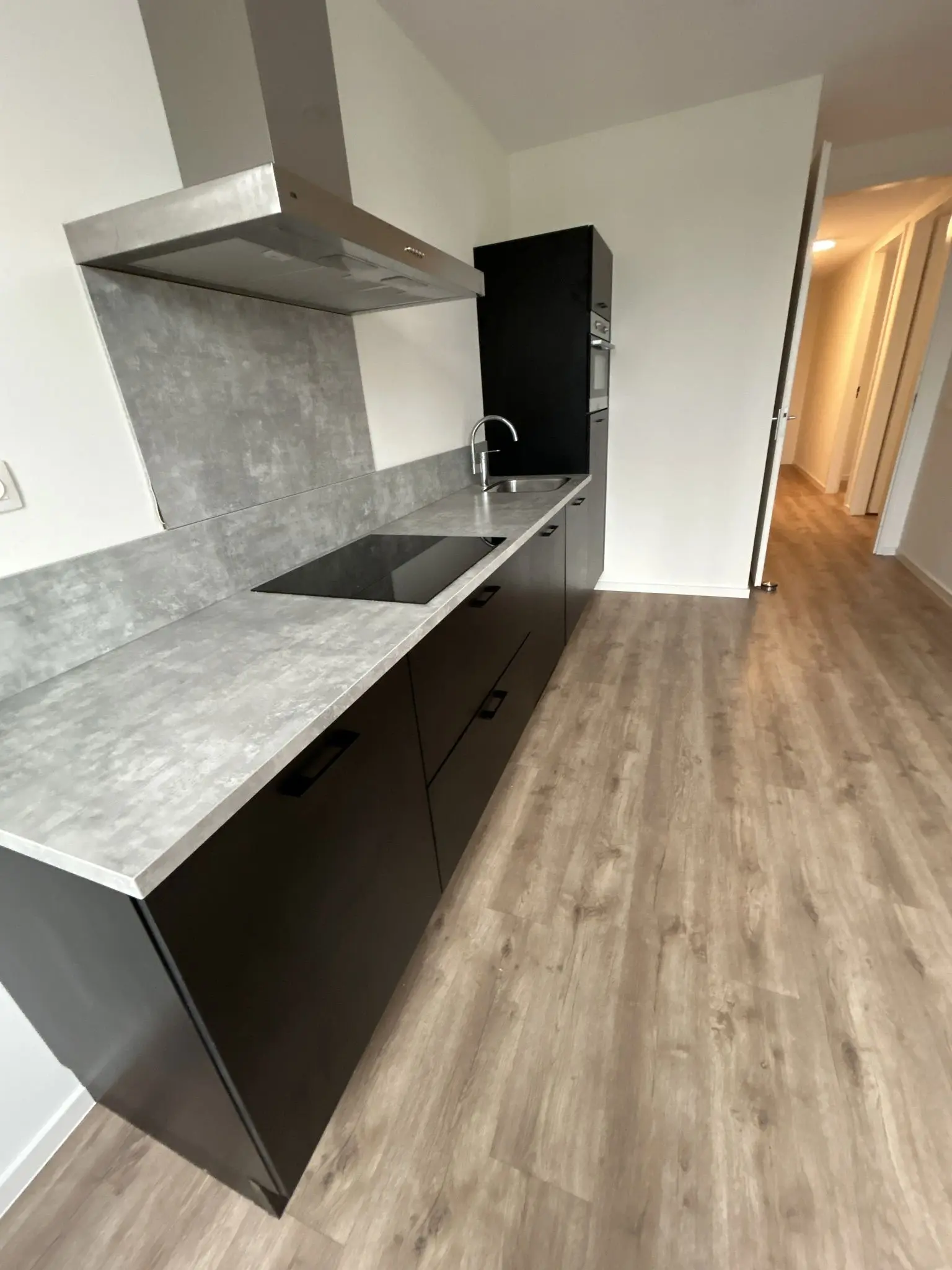 De moderne keuken is volledig uitgerust met een koelkast met vriesvak, combimagnetron, inductiekookplaat, afzuigkap en een vaatwasser.