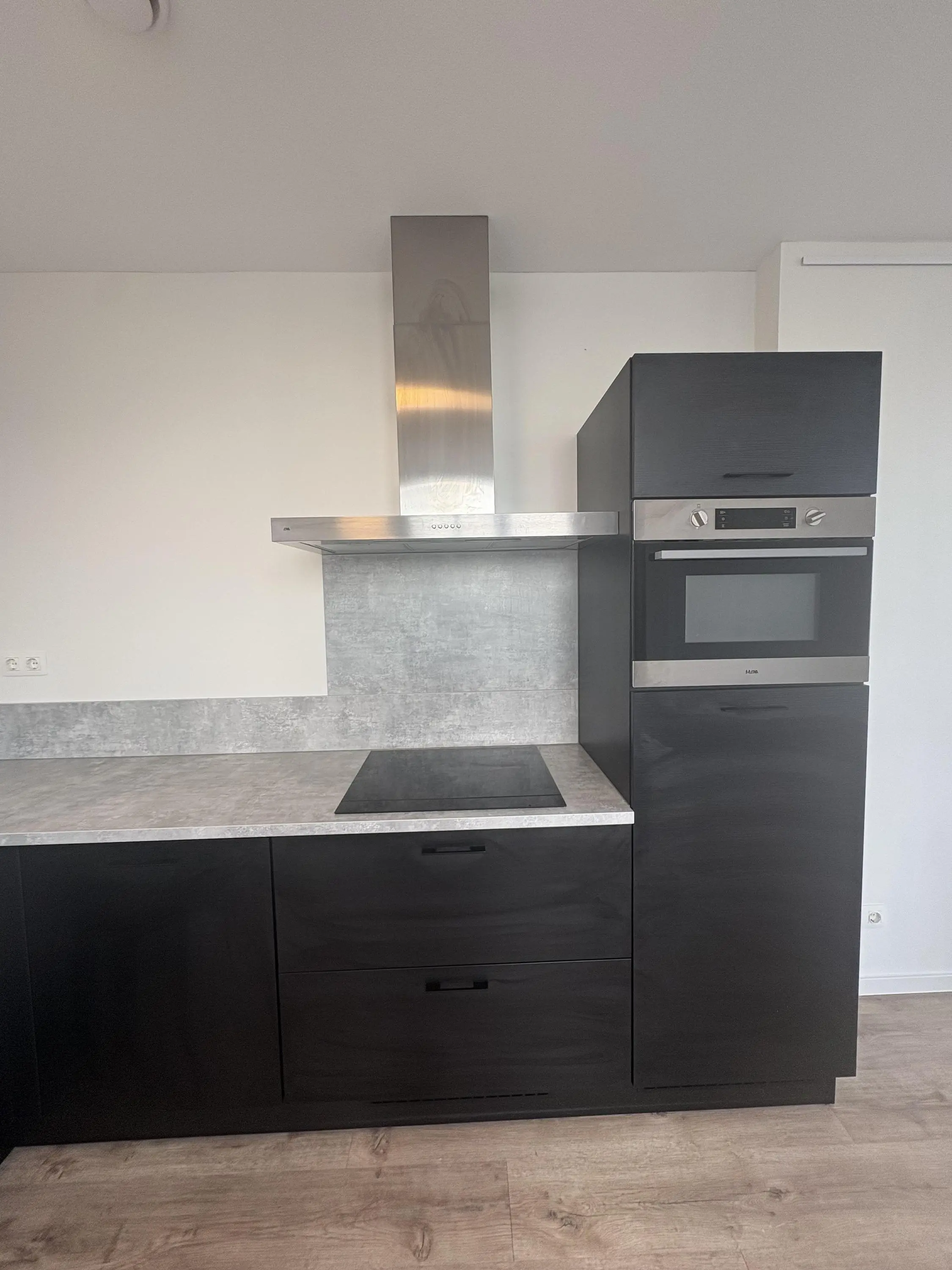 De moderne keuken is volledig uitgerust met een koelkast met vriesvak, combimagnetron, inductiekookplaat, afzuigkap en een vaatwasser.
