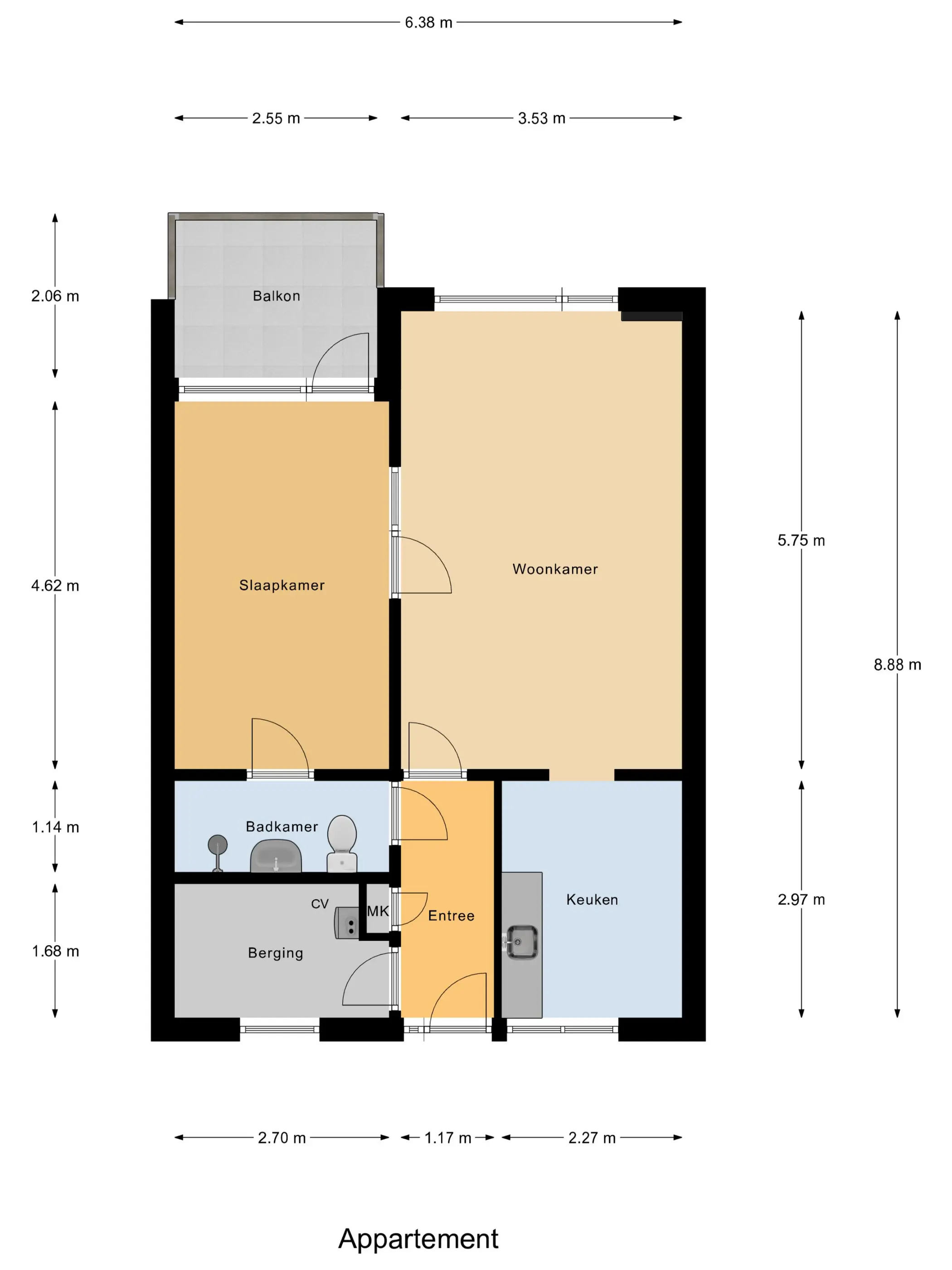 De woning is te bereiken door middel van het trappenhuis en de galerij. Entree met meterkast, inpandige bijkeuken/berging CV-ketel (Intergas van 2017).