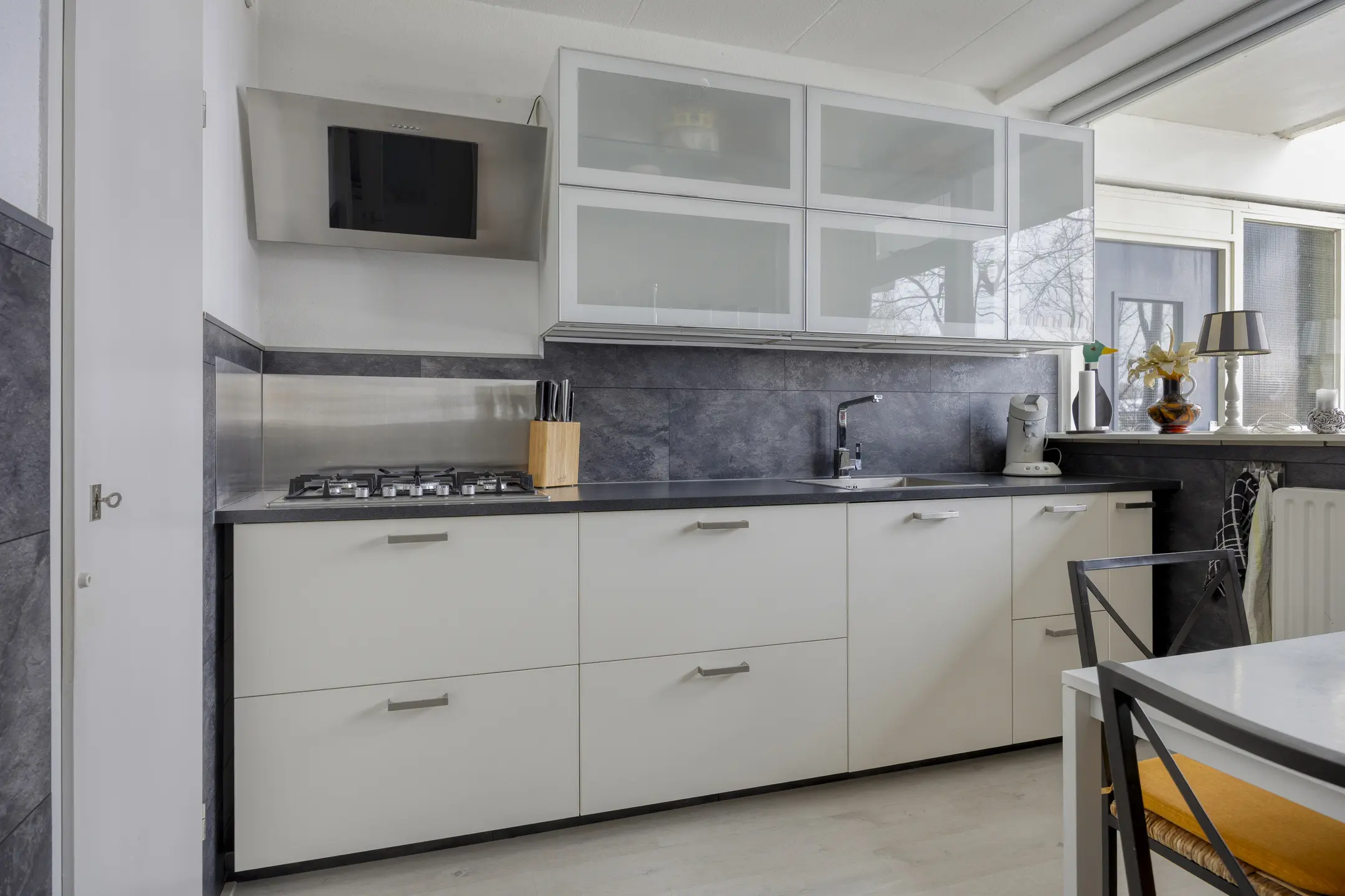 Aan de rechterkant van de gang vind je de keuken en eethoek. De keuken is praktisch ingericht en voorzien van een fornuis en afzuigkap. De badkamer is voorzien van een wastafel en een ruime inloopdouche. Daarnaast is er een apart toilet, gelegen naast de badkamer.